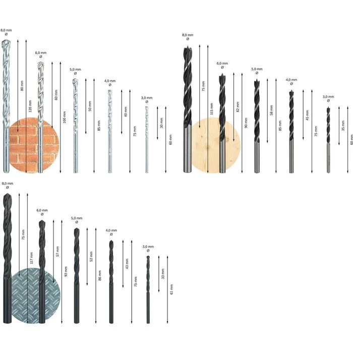 Lieferung: inkl. 15 Teilen (5x Metallbohrer HSS-R, 5x Holzbohrer, 5x Steinbohrer)