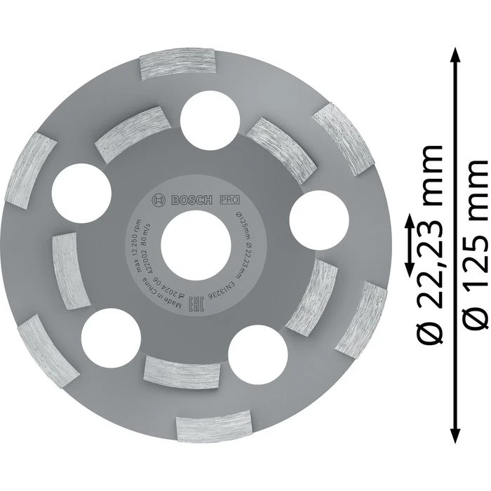 sonstiges: ist für den Einsatz auf Beton, Natur- und Kunststein vorgesehen, bietet eine hohe Abtragsleistung bei großflächigem abrasivem Material, wie beispielsweise Kalksandputz, Hartoberputz, Sandstein und sehr abrasivem Beton, seine optimierte Diamantmatrix sorgt für gute Ergebnisse, während die Reihenanordnung das Material schnell abtransportiert, die dynamische Auswuchtung ermöglicht vibrationsfreies Arbeiten