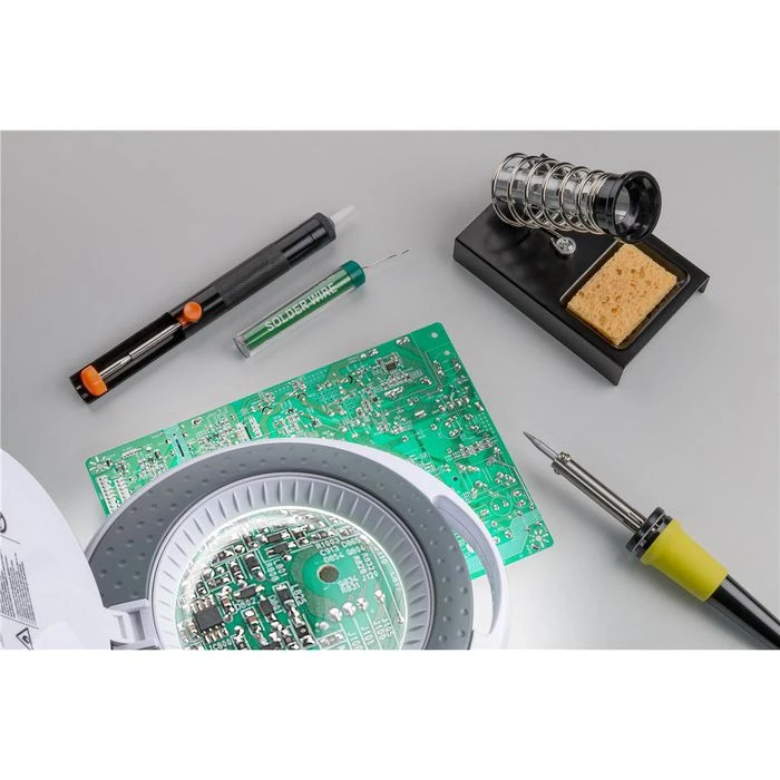 Lieferung: inkl. Lötkolben, Lötkolbenständer, Entlötpumpe mit Antihaft-beschichteter Entlötsaugspitze und Lötzinnspule