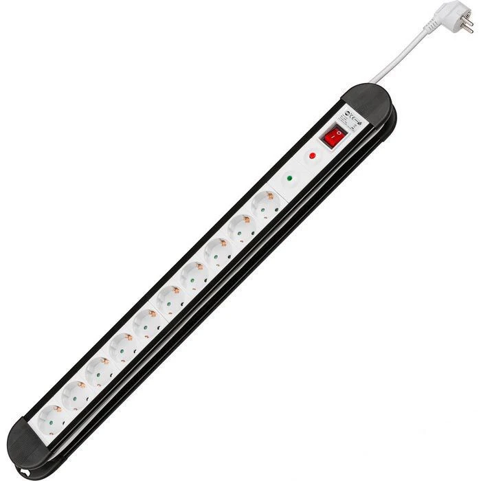 sonstiges: hochbruchfestes Gehäuse, beleuchteter Ein-/Ausschalter, Funktionskontrollleuchte signalisiert Betriebsbereitschaft des Überspannungsschutzes, Reset-Knopf, 45 Grad Steckdosenanordnung, erweiterter Berührungsschutz