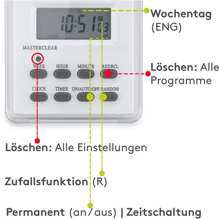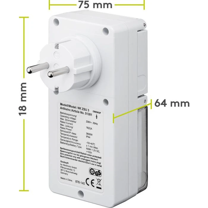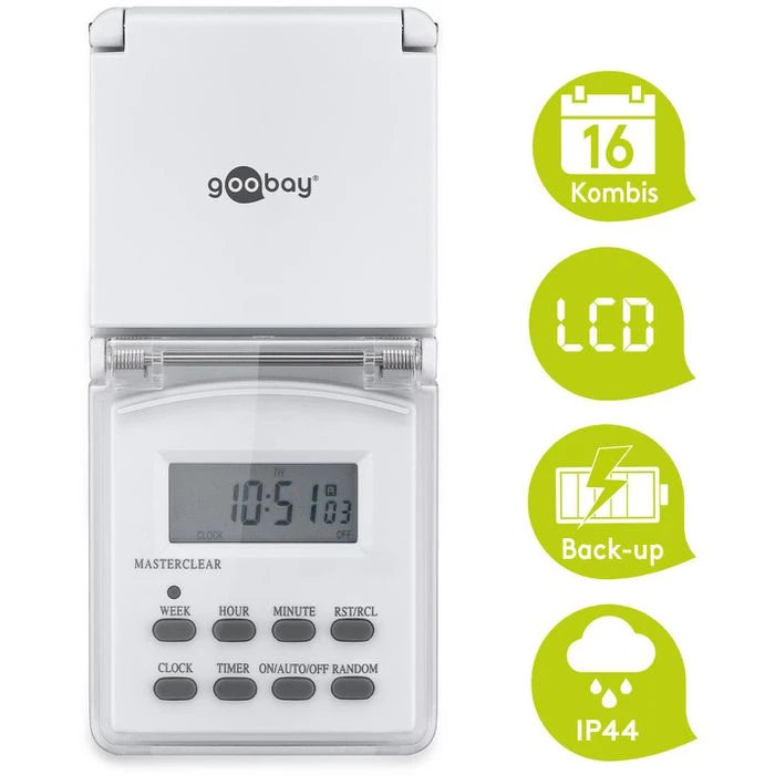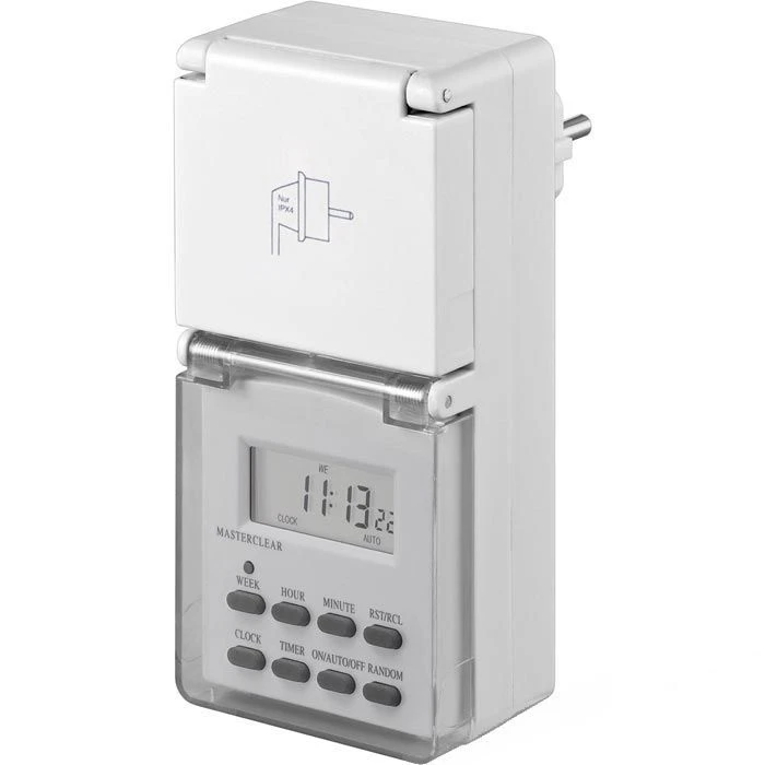 Funktionen: 10 Schaltprogramme in 1 Minutenschritten, 16 Wochentagkombinationen, Dauerbetrieb