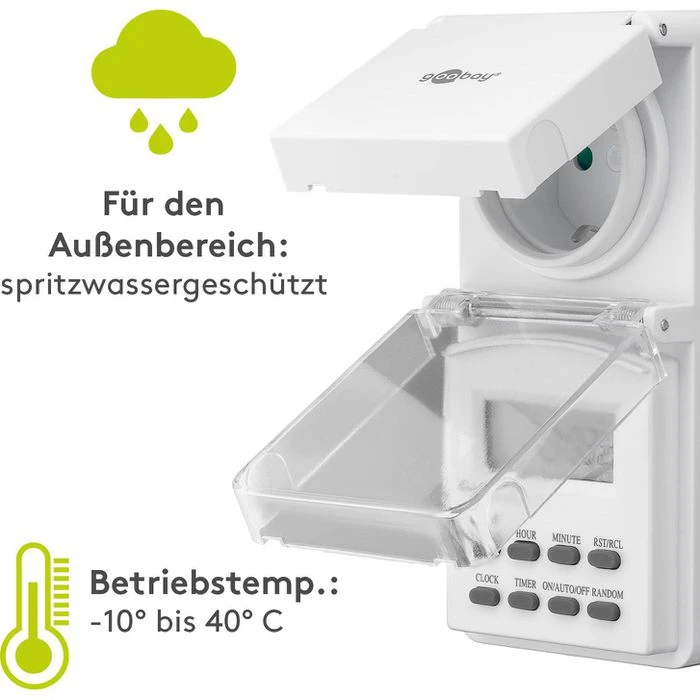 sonstiges: spritzwassergeschützt (IP44), LCD-Anzeige, 12- oder 24-Stundenanzeige, erhöhter Berührungsschutz